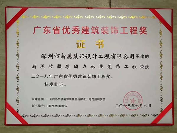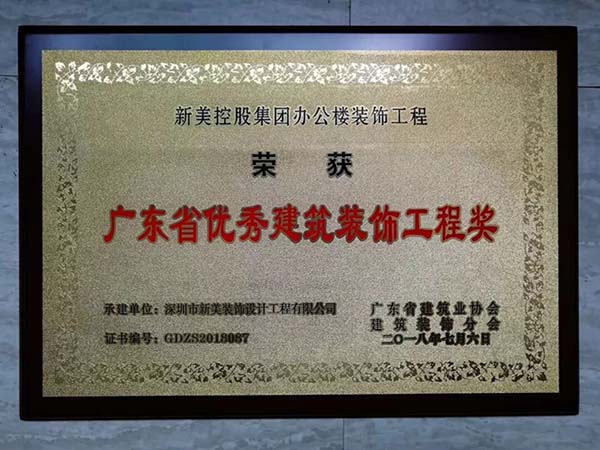 廣東省優秀建筑裝飾工程獎是由廣東省建筑裝飾行業協會設立的省內具有權威性的建筑裝飾類別獎項,對提高我公司在建設行業的競爭力具有重要意義。本次的獲獎,是新美人共同努力的結果,更是廣大客戶和業界專家對新美裝飾工程品質的充分肯定與認可。